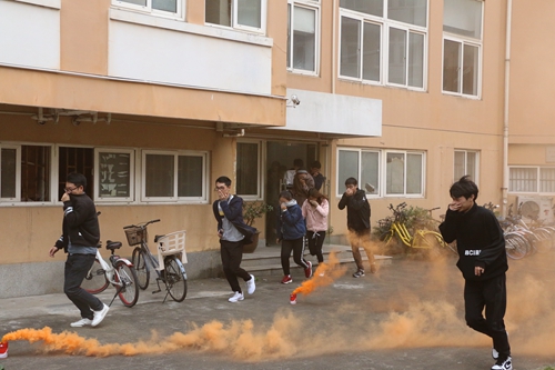 在演练开始前,工作人员已经点燃烟雾器,橙色的烟雾弥散了整个楼道,制造了“火灾现场”,在师生们准备逃离火场时,纷纷按照徐老师的方法进行自救,并在其他老师的协助下,逃离“火灾”现场,迅速地向安全地带转移,整个过程紧张而有秩序,最终所有师生安全地撤离。通过这次演练,不仅切实提高了学院处理突发事件的能力,提高了师生员工遭遇火灾等突发事件时的应变能力和自我防护能力。