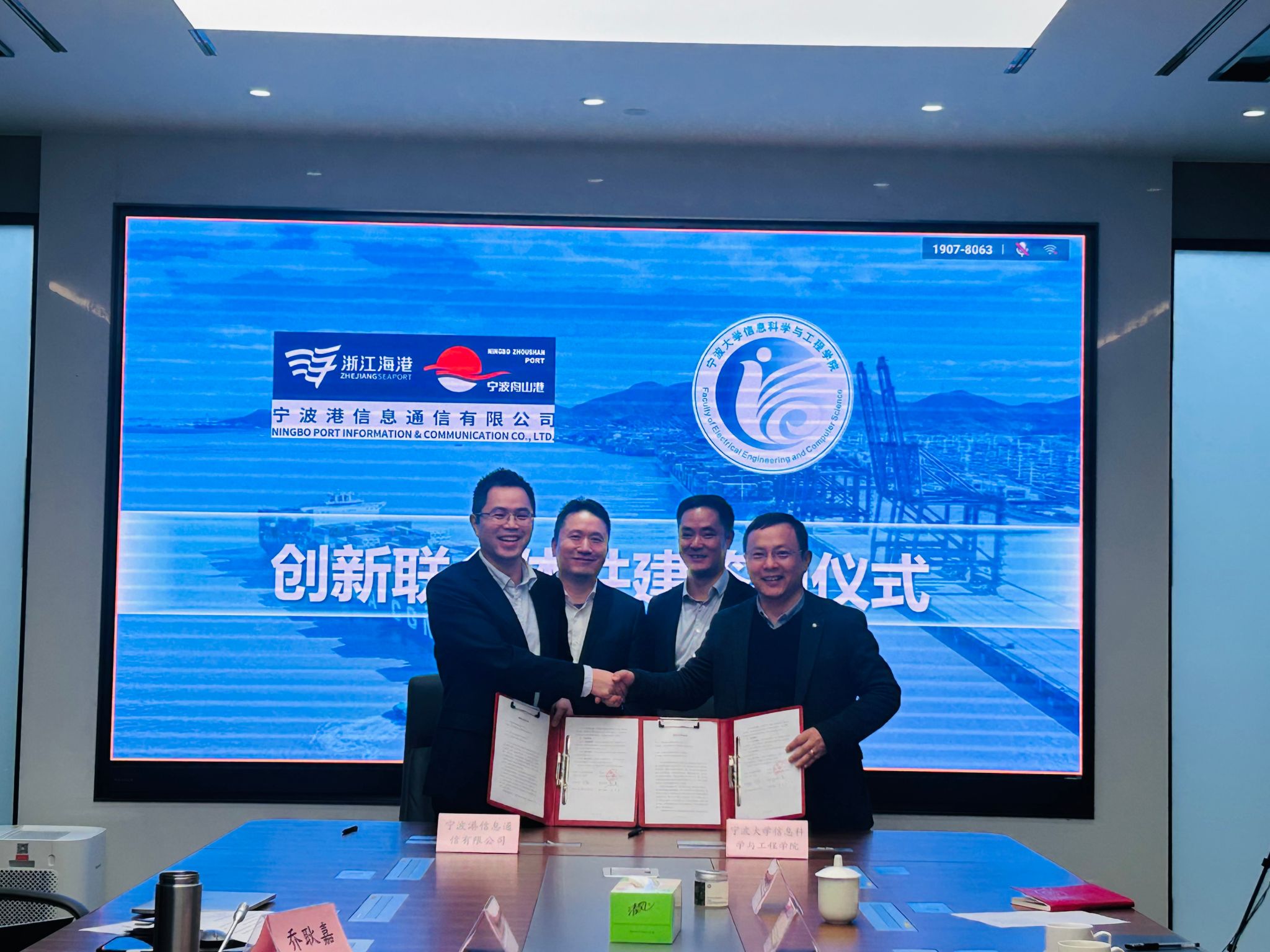 宁波港信息通信有限公司党总支书记兼董事长黄深广、党总支副书记兼总经理黄昂涛亲切接见沈祥一行。双方共同参观了公司展厅,了解了宁波舟山港股份有限公司及宁波港信息通信有限公司的发展历程和目前业务规模情况。随后,双方代表举行了座谈交流会。会上,双方就自身发展基本情况、产学研合作项目、合作机制模式等问题展开了充分讨论,本着优势互补、互学互鉴的原则双方达成了包含科研人才资源共享、港航智能化等前沿技术合作研发、高能级科创平台互帮共建、学生实习实践基地共创共建等多项合作内容。最后,双方举行了签约仪式,王强、王健代表双方进行了签约。