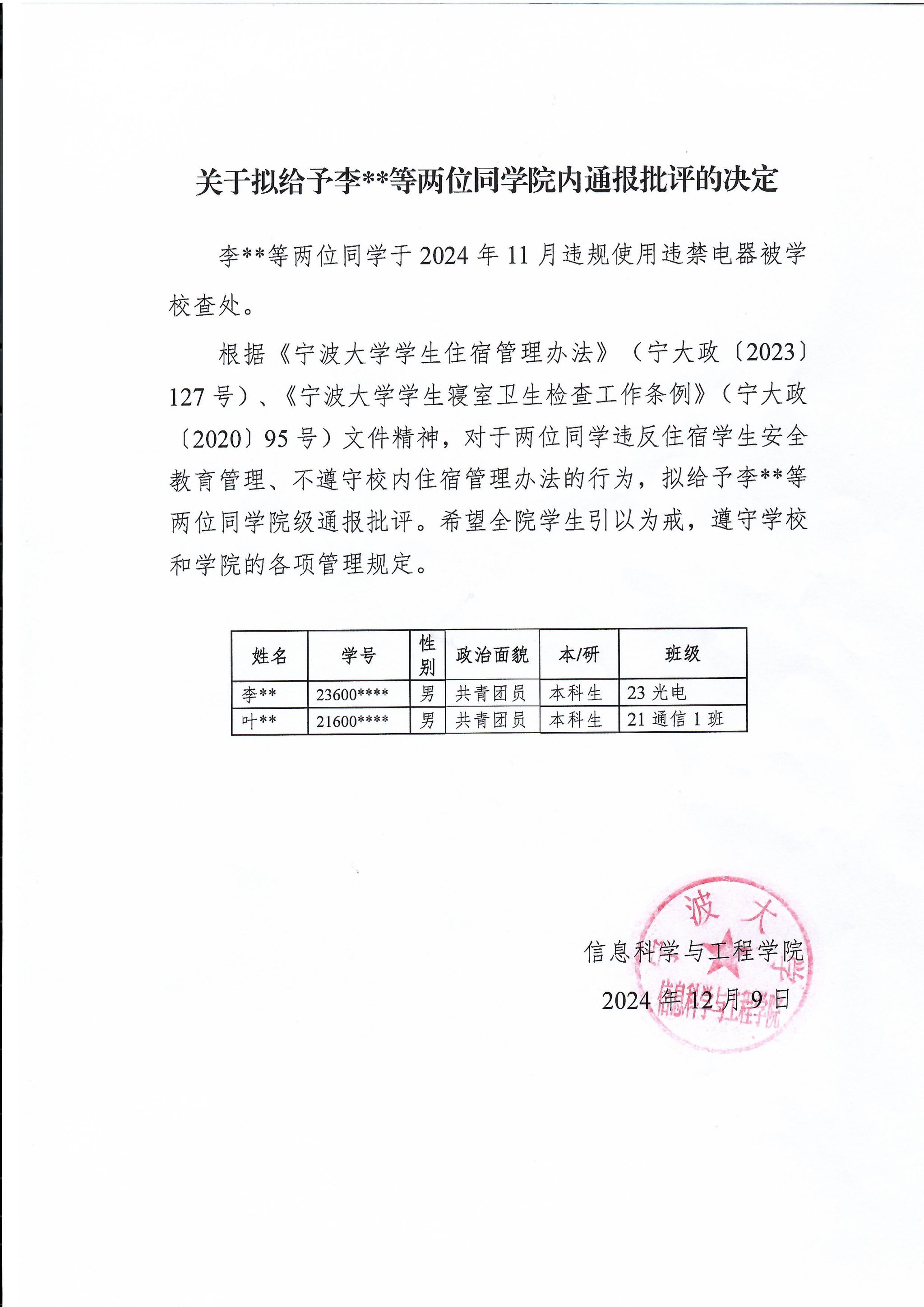关于拟给予李**等两位同学院内通报批评的决定