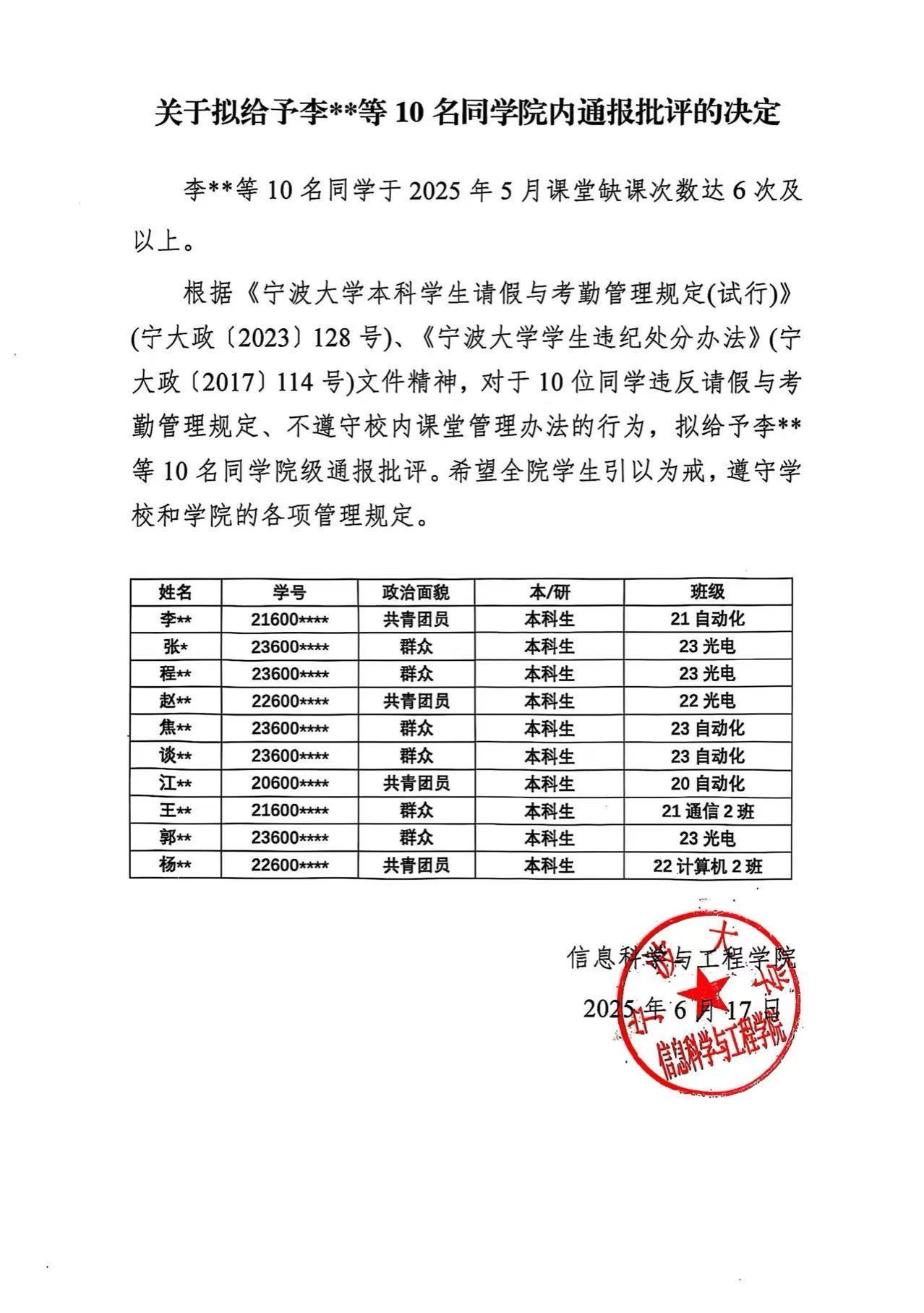 关于拟给予李**等10名同学院内通报批评的决定