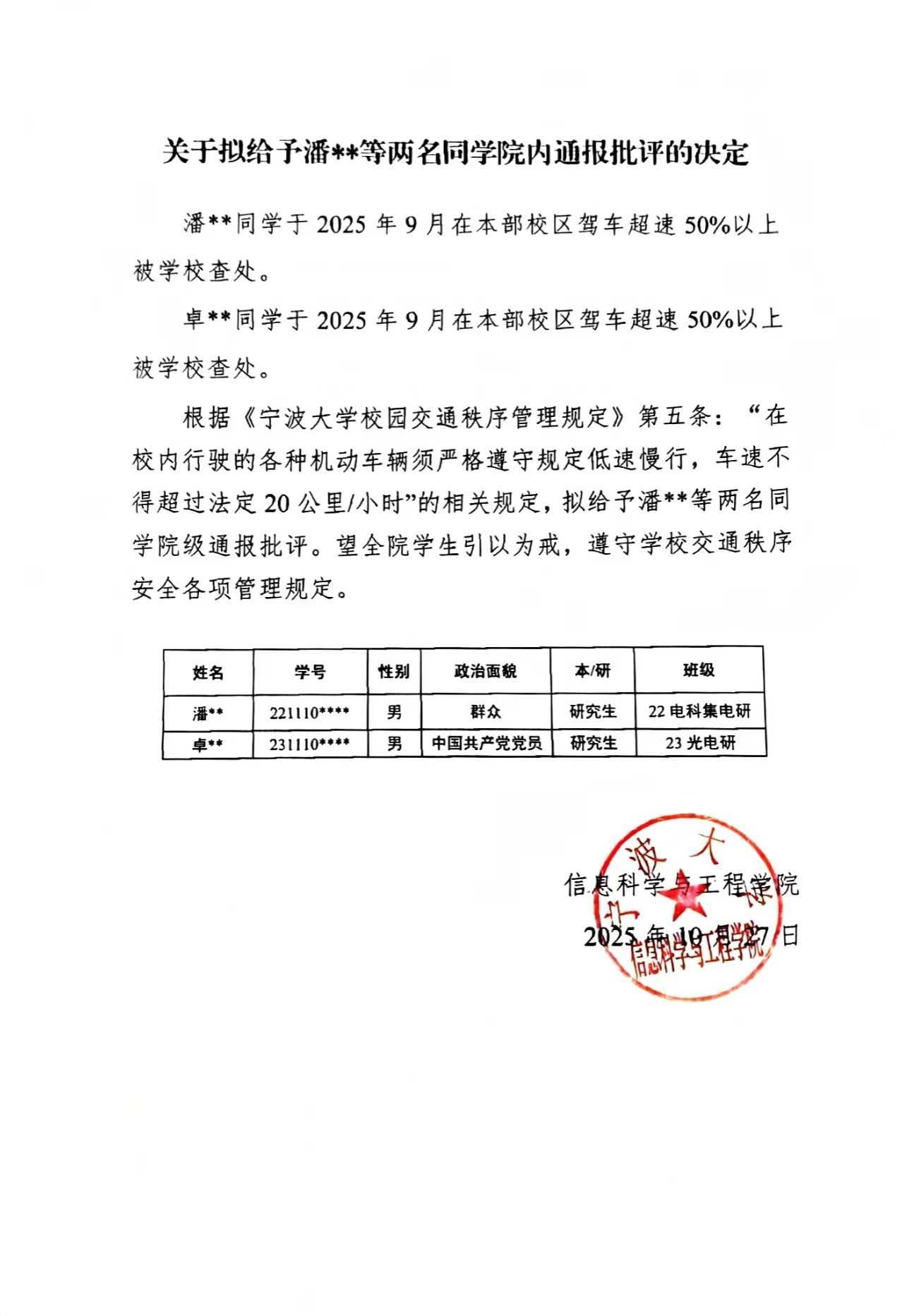 关于拟给予潘**等两名同学院内通报批评的决定
