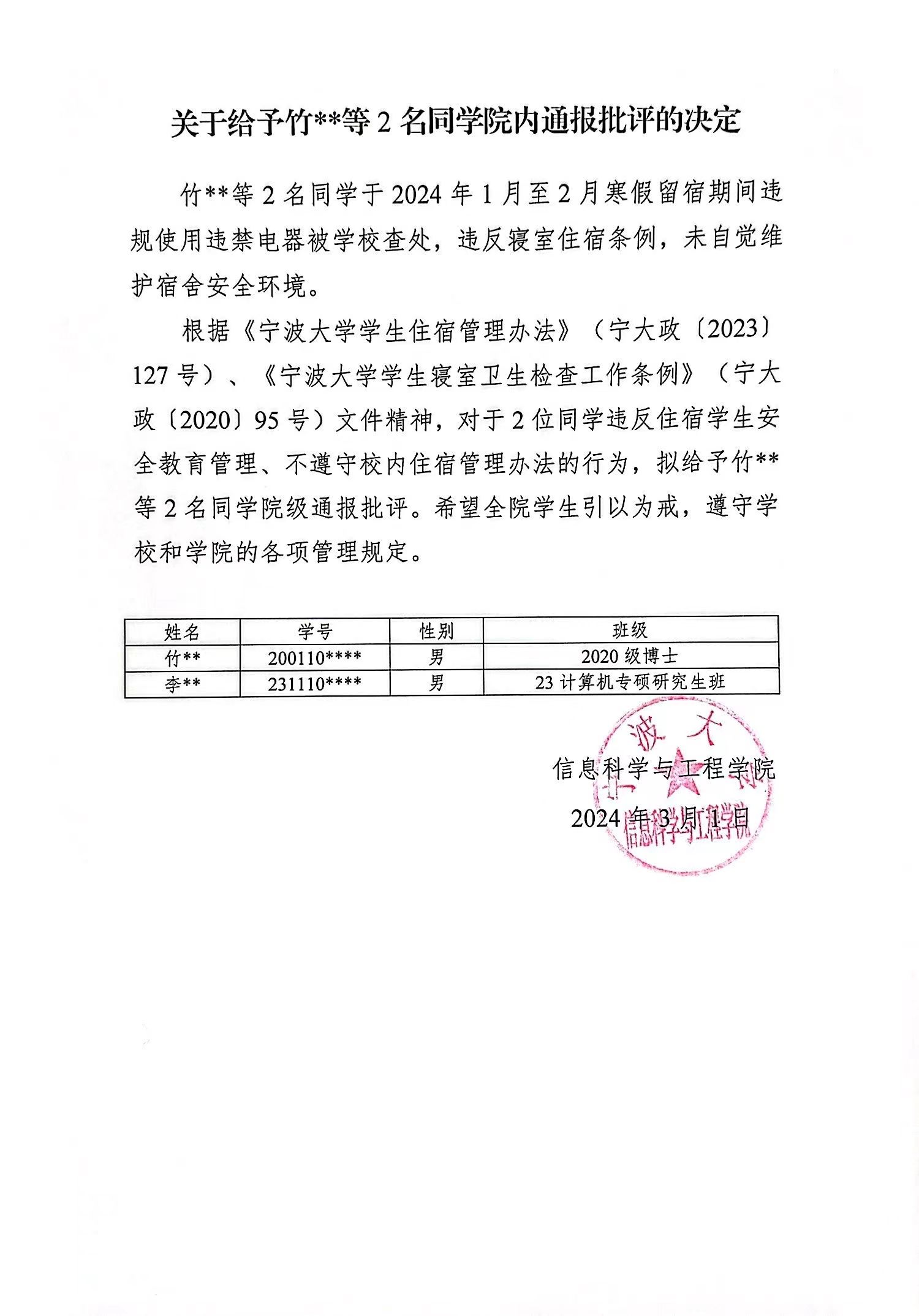 关于给予竹XX等2名同学院内通报批评的决定