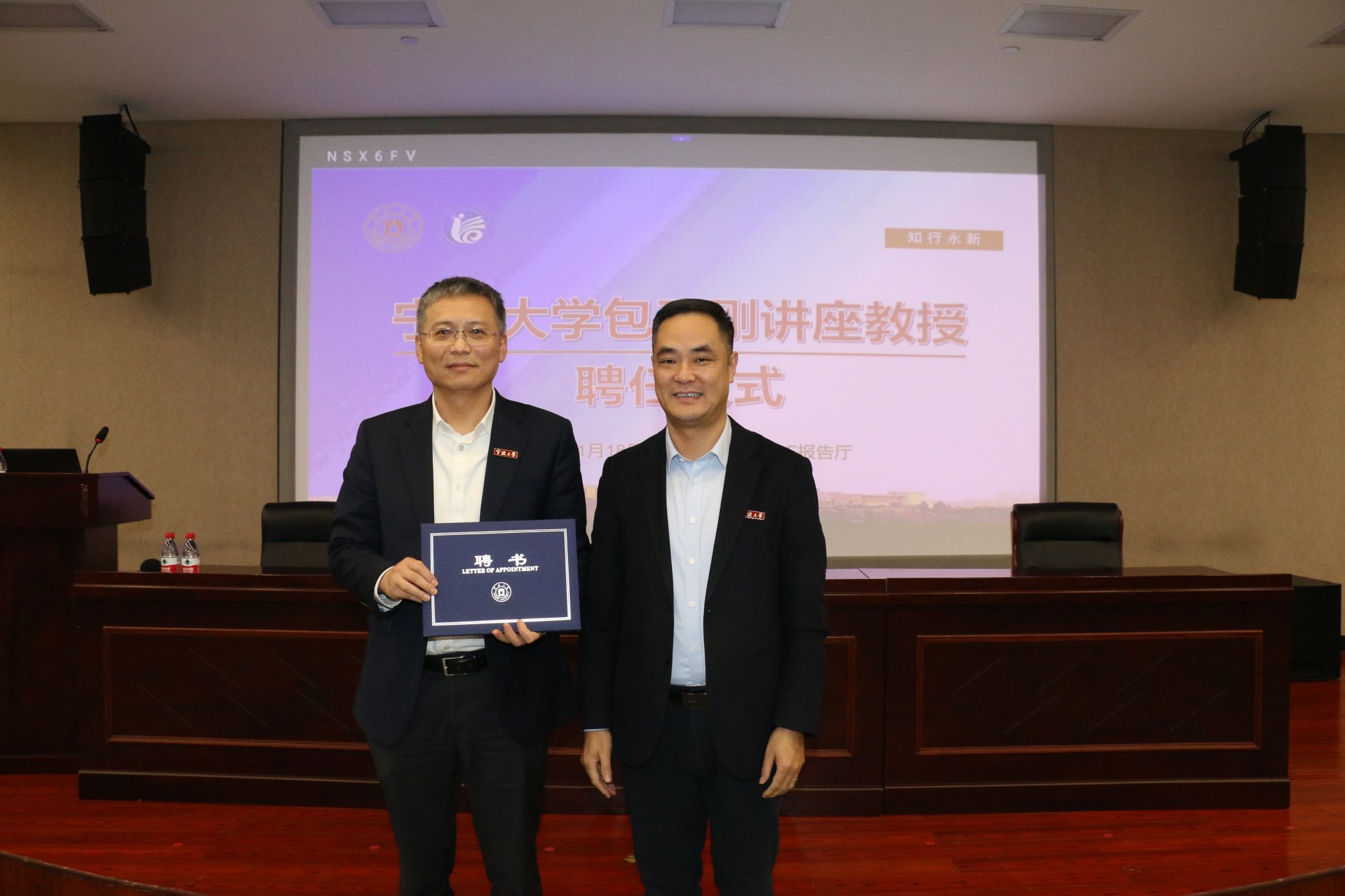 院长沈祥为范峻教授颁发包玉刚讲座教授聘书并佩戴校徽,对范教授的加盟表示诚挚欢迎与感谢。人事处副处长谢冰蕾代表学校人才办向范峻教授颁发纪念品,对通过范教授搭建学校与产业间的桥梁表示感谢。