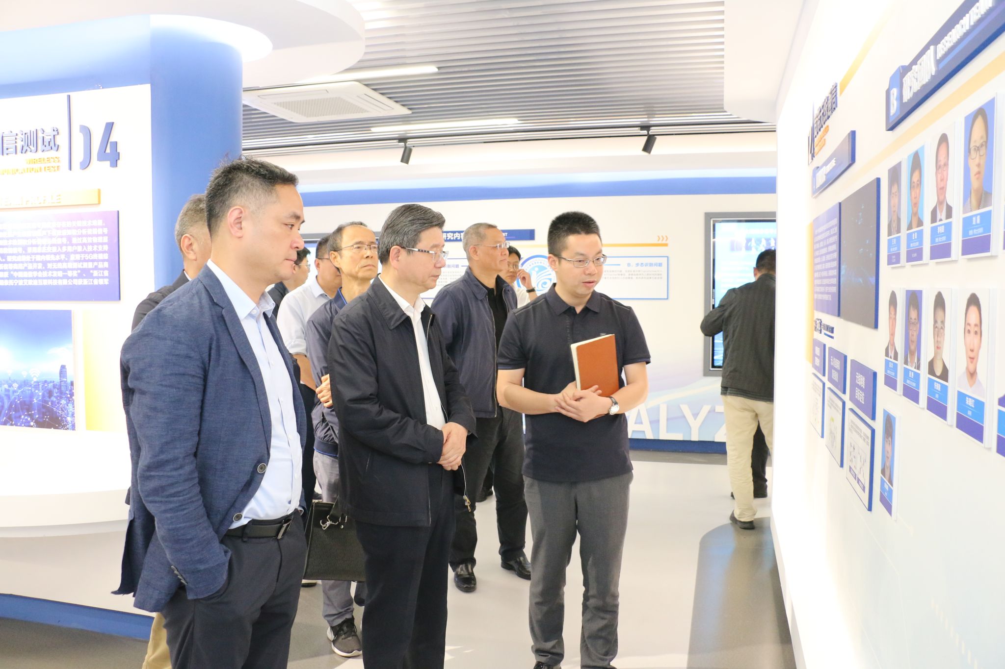 多媒体工程中心展厅。展厅内展示了学院近年来在智能制造、信息技术等领域取得的重大科研成果和创新产品。参观过程中,陈炳荣主任对学院的研究成果表现出浓厚兴趣,并与相关科研团队进行了深入交流。